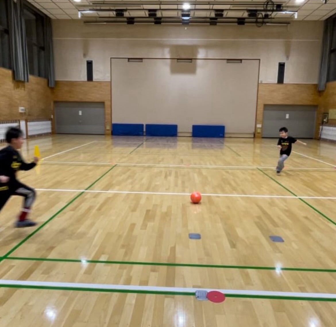 2人で、5か所のコーン間のうち2か所パスを通して